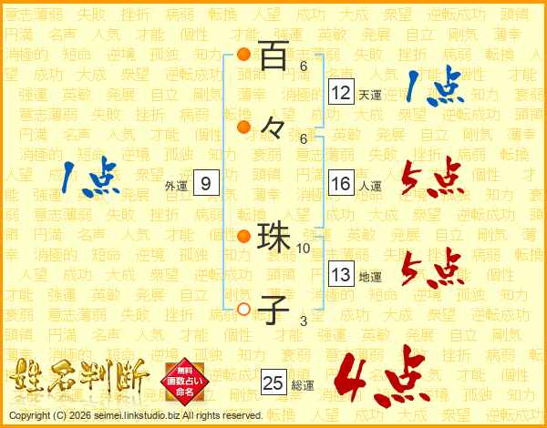 生活面を象徴する運勢です。外部から受ける影響力を表し、結婚運、家庭運や職場、環境への順応性を表します。総運から人運を引いた画数。姓や名が1文字の場合を除く。
