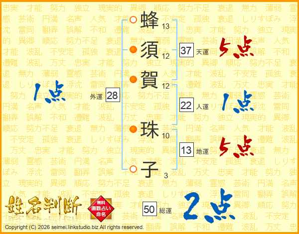 蜂(13画)須(12画)賀(12画) 珠(10画)子(3画)