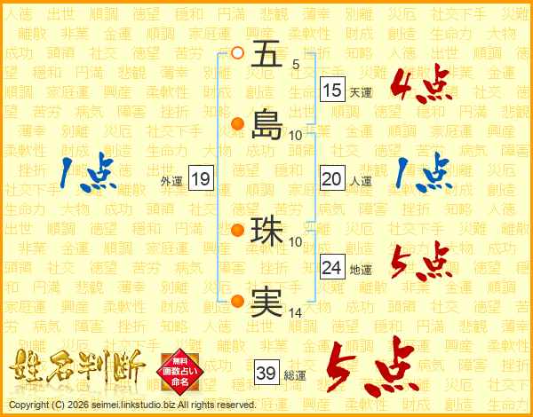 生活面を象徴する運勢です。外部から受ける影響力を表し、結婚運、家庭運や職場、環境への順応性を表します。総運から人運を引いた画数。姓や名が1文字の場合を除く。