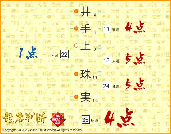 井(4画)手(4画)上(3画) 珠(10画)実(14画)