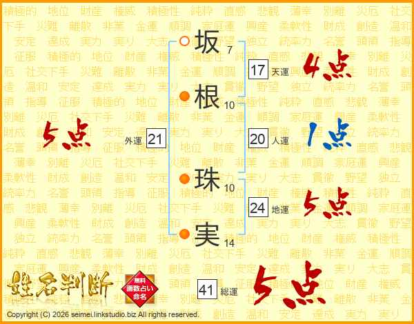 坂(7画)根(10画) 珠(10画)実(14画)