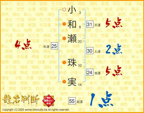 小(3画)和(8画)瀬(20画) 珠(10画)実(14画)