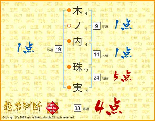 木(4画)ノ(1画)内(4画) 珠(10画)実(14画)