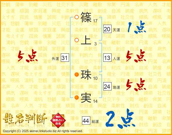 生活面を象徴する運勢です。外部から受ける影響力を表し、結婚運、家庭運や職場、環境への順応性を表します。総運から人運を引いた画数。姓や名が1文字の場合を除く。