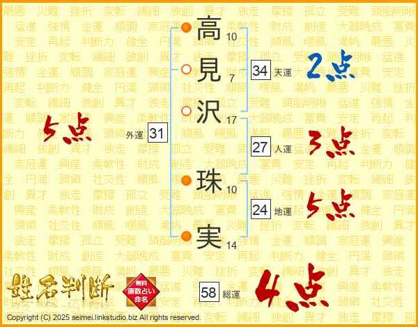 高(10画)見(7画)沢(17画) 珠(10画)実(14画)