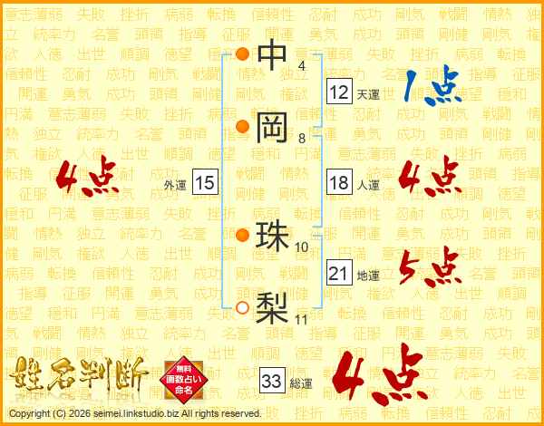 中(4画)岡(8画) 珠(10画)梨(11画)