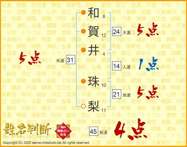 和(8画)賀(12画)井(4画) 珠(10画)梨(11画)