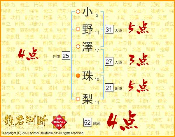 小野澤珠梨さんの総運は52画の4点!