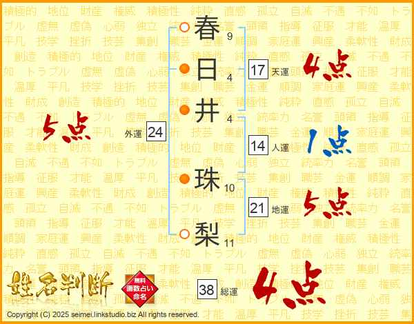 春(9画)日(4画)井(4画) 珠(10画)梨(11画)