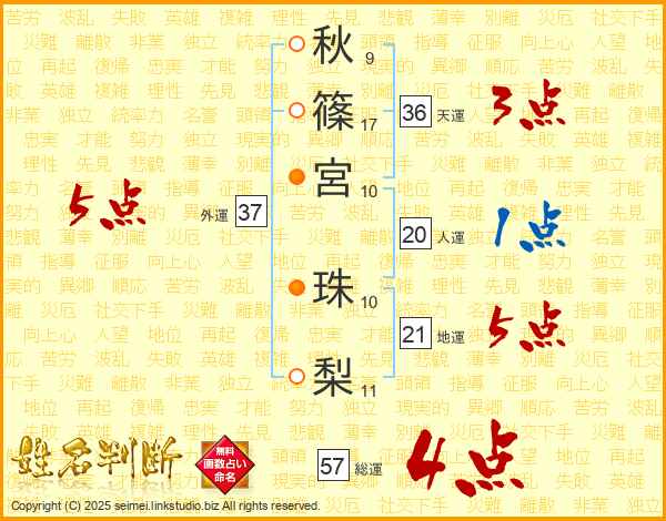 秋篠宮珠梨さんの総運は57画の4点!