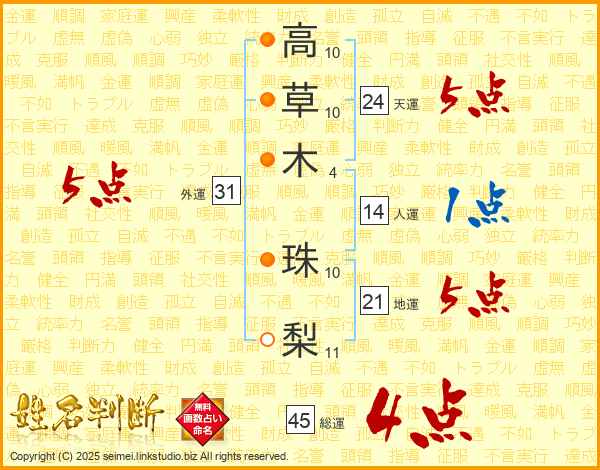 高(10画)草(10画)木(4画) 珠(10画)梨(11画)