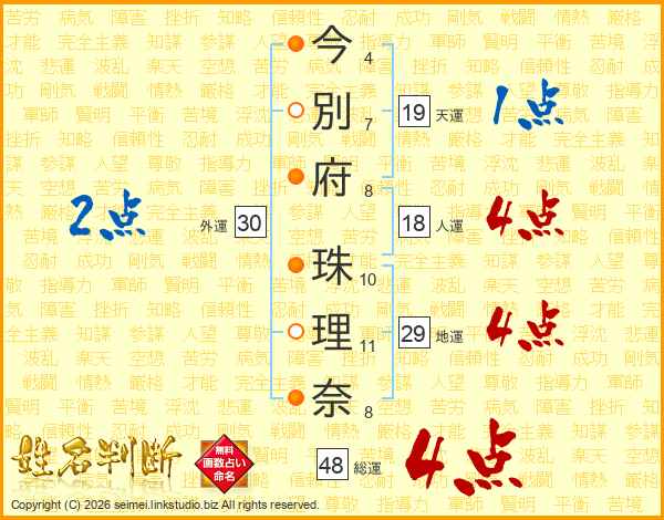 今(4画)別(7画)府(8画) 珠(10画)理(11画)奈(8画)