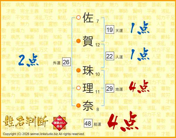 佐(7画)賀(12画) 珠(10画)理(11画)奈(8画)