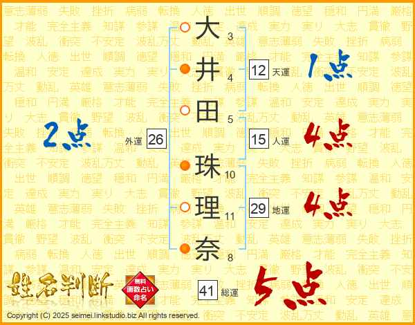 大(3画)井(4画)田(5画) 珠(10画)理(11画)奈(8画)