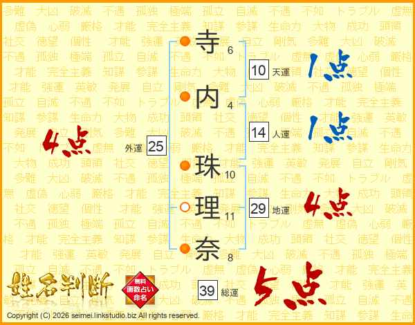 寺(6画)内(4画) 珠(10画)理(11画)奈(8画)