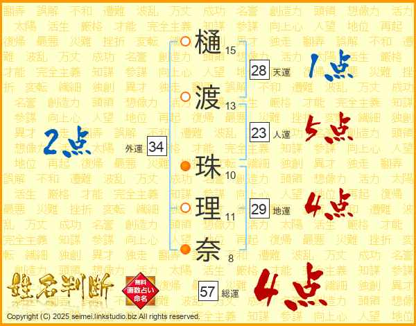 樋(15画)渡(13画)  珠(10画)理(11画)奈(8画)