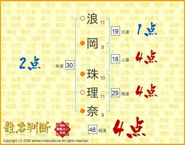 浪(11画)岡(8画) 珠(10画)理(11画)奈(8画)