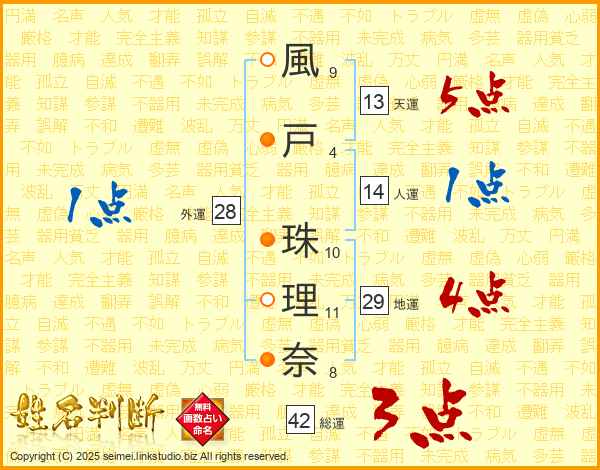風(9画)戸(4画) 珠(10画)理(11画)奈(8画)