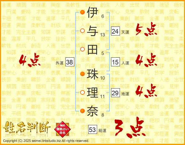 伊(6画)与(13画)田(5画) 珠(10画)理(11画)奈(8画)