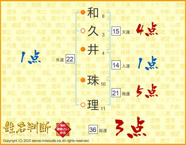 和(8画)久(3画)井(4画) 珠(10画)理(11画)