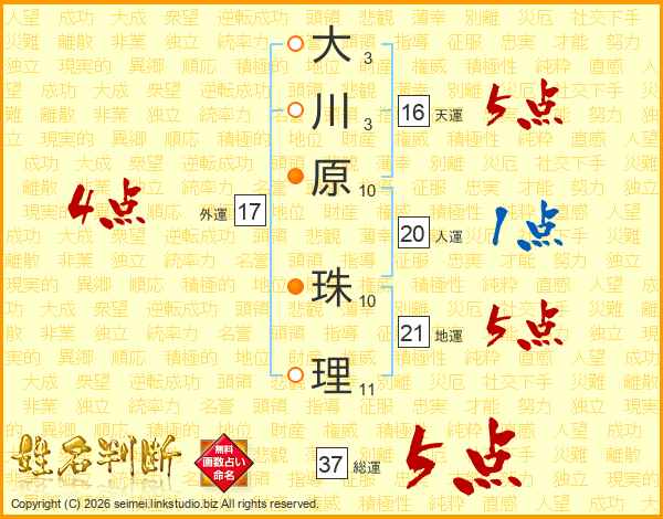 大(3画)川(3画)原(10画) 珠(10画)理(11画)
