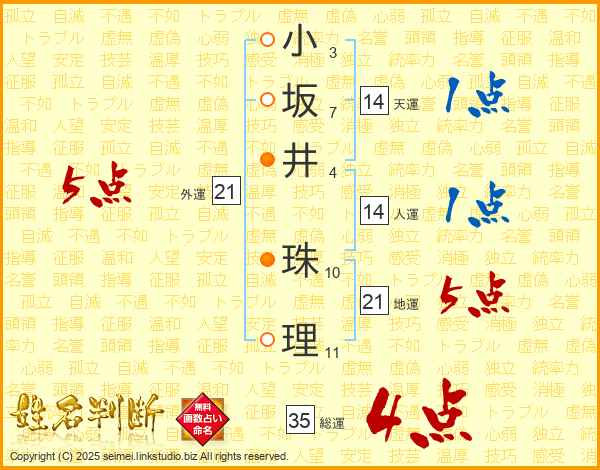 小(3画)坂(7画)井(4画) 珠(10画)理(11画)