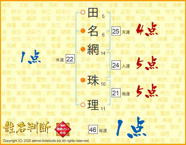 田(5画)名(6画)網(14画) 珠(10画)理(11画)