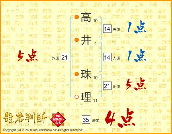 高(10画)井(4画) 珠(10画)理(11画)