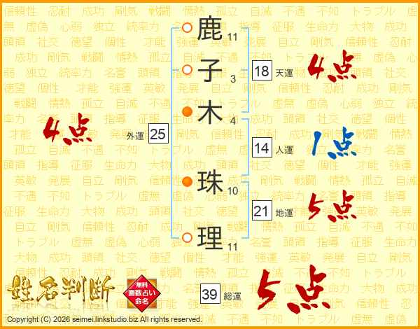 鹿(11画)子(3画)木(4画) 珠(10画)理(11画)