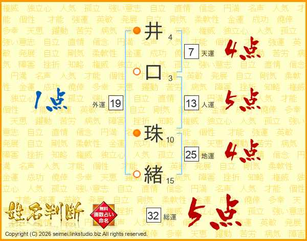 生活面を象徴する運勢です。外部から受ける影響力を表し、結婚運、家庭運や職場、環境への順応性を表します。総運から人運を引いた画数。姓や名が1文字の場合を除く。
