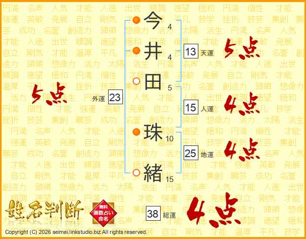 今(4画)井(4画)田(5画) 珠(10画)緒(15画)