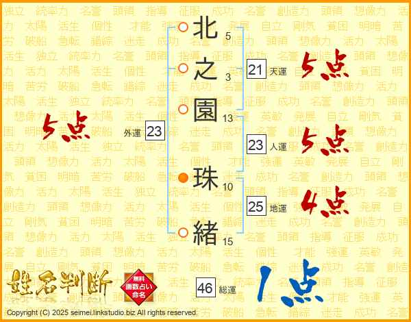 北(5画)之(3画)園(13画) 珠(10画)緒(15画)