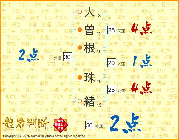 大(3画)曽(12画)根(10画) 珠(10画)緒(15画)