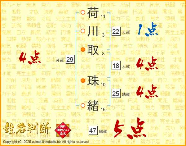 荷(11画)川(3画)取(8画) 珠(10画)緒(15画)