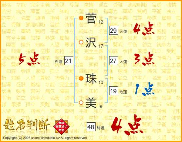 菅(12画)沢(17画) 珠(10画)美(9画)