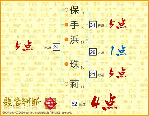 保(9画)手(4画)浜(18画) 珠(10画)莉(11画)