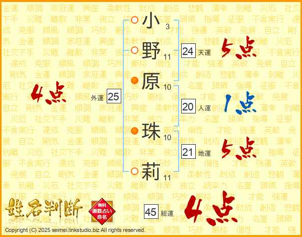 小(3画)野(11画)原(10画) 珠(10画)莉(11画)
