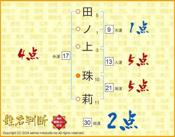 田(5画)ノ(1画)上(3画) 珠(10画)莉(11画)