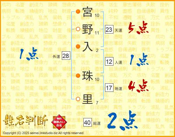 宮(10画)野(11画)入(2画) 珠(10画)里(7画)