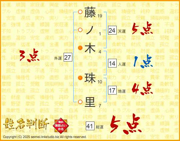 藤(19画)ノ(1画)木(4画) 珠(10画)里(7画)