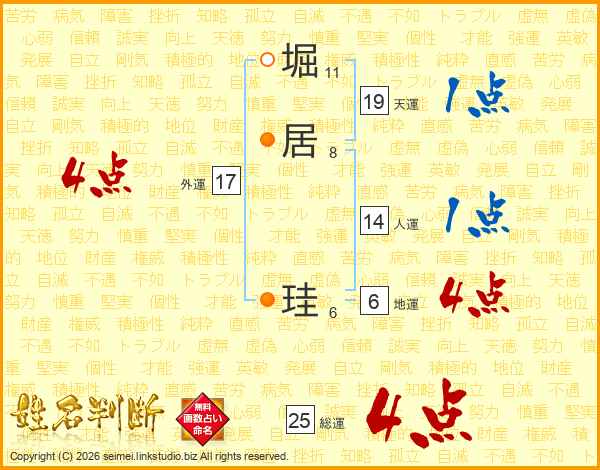 生活面を象徴する運勢です。外部から受ける影響力を表し、結婚運、家庭運や職場、環境への順応性を表します。総運から人運を引いた画数。姓や名が1文字の場合を除く。