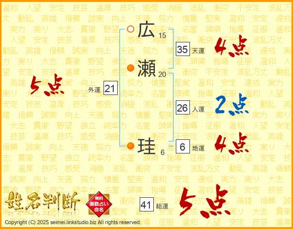 生活面を象徴する運勢です。外部から受ける影響力を表し、結婚運、家庭運や職場、環境への順応性を表します。総運から人運を引いた画数。姓や名が1文字の場合を除く。