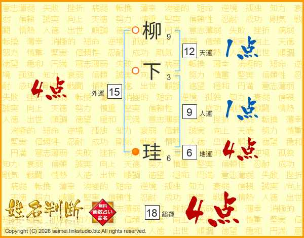 画数の奇数(○陽)と偶数(●陰)の配列で吉凶を占います。どちらかにかたよる名前は大凶名で避ける必要があります。画数の奇数偶数。