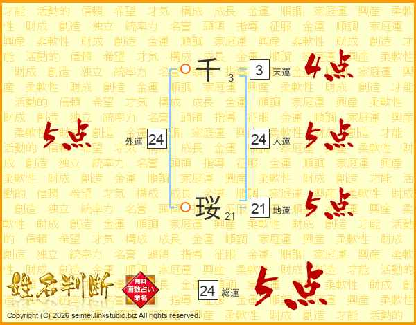 生活面を象徴する運勢です。外部から受ける影響力を表し、結婚運、家庭運や職場、環境への順応性を表します。総運から人運を引いた画数。姓や名が1文字の場合を除く。