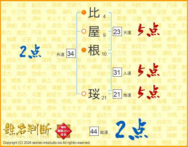 生活面を象徴する運勢です。外部から受ける影響力を表し、結婚運、家庭運や職場、環境への順応性を表します。総運から人運を引いた画数。姓や名が1文字の場合を除く。