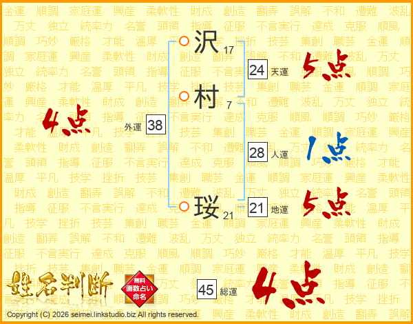沢村珱さんの総運は45画の4点