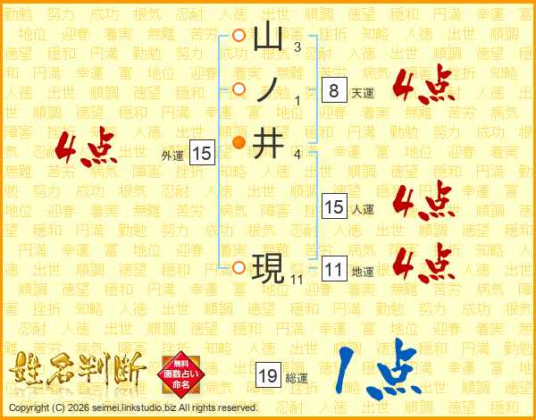 生活面を象徴する運勢です。外部から受ける影響力を表し、結婚運、家庭運や職場、環境への順応性を表します。総運から人運を引いた画数。姓や名が1文字の場合を除く。