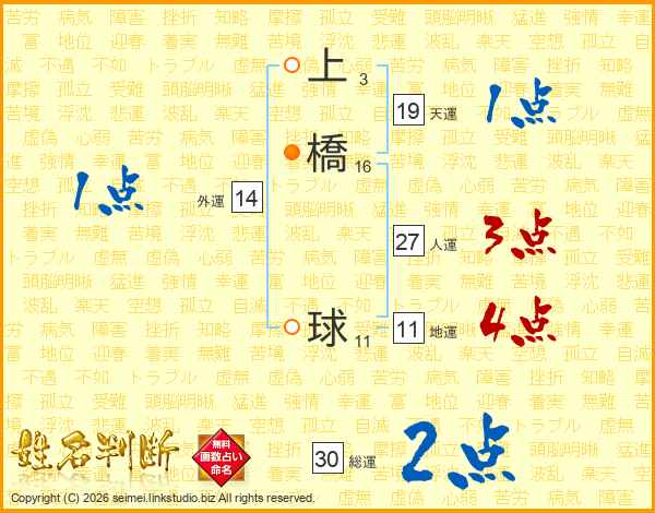 上橋球さんの人運は27画の3点!