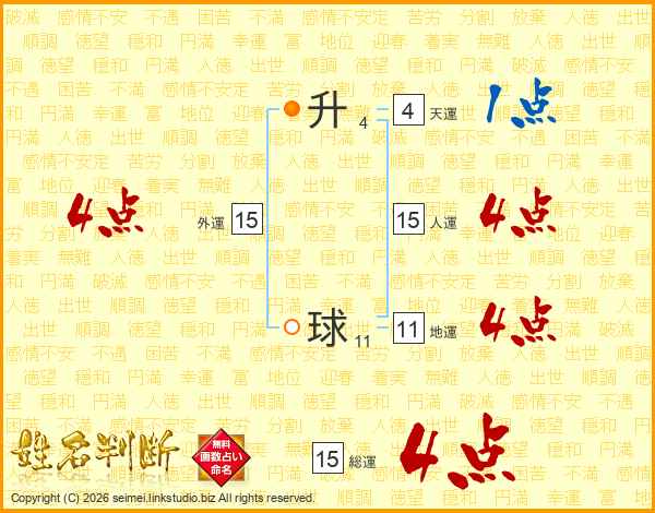 生活面を象徴する運勢です。外部から受ける影響力を表し、結婚運、家庭運や職場、環境への順応性を表します。総運から人運を引いた画数。姓や名が1文字の場合を除く。