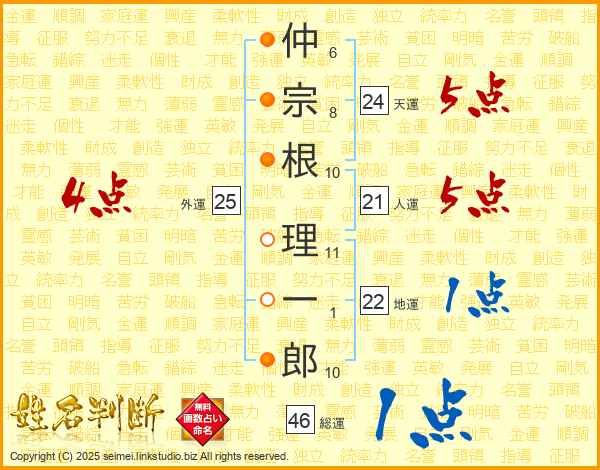 仲(6画)宗(8画)根(10画) 理(11画)一(1画)郎(10画)